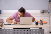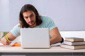 Młody student przygotowujący się do egzaminów w domu w tele-edukacji