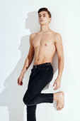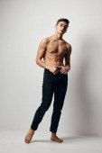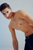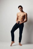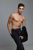 Dżentelmen w ciemnych ciuchach na szarym tle, nagi tułów, widok z tyłu