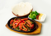 Mukimo, kuchnia kenijska, gulasz mięsny, z chapatis na białym tle, widok z góry, brak osób, poziomy,