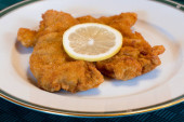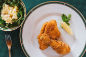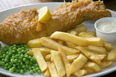Ryby z frytkami z groszkiem i cytryną na białym talerzu Close Up, tradycyjne danie kuchni brytyjskiej lub angielskiej