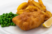 Zdjęcie "Ryby z frytkami z groszkiem i cytryną na białym talerzu Close Up, tradycyjne danie kuchni brytyjskiej lub angielskiej" może być wykorzystywane do celów osobistych i komercyjnych zgodnie z warunkami zakupionej licencji Royalty-free. Obraz jest dostępny do pobrania w jakości wysokiej rozdzielczości do 5760x3840.