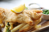 Zdjęcie "Ryby z frytkami z groszkiem i cytryną na białym talerzu Close Up, typowe tradycyjne danie kuchni brytyjskiej" może być wykorzystywane do celów osobistych i komercyjnych zgodnie z warunkami zakupionej licencji Royalty-free. Obraz jest dostępny do pobrania w jakości wysokiej rozdzielczości do 5760x3840.