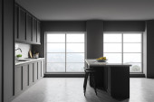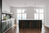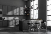 Zdjęcie "Widok z boku nowoczesnej kuchni z białymi i szarymi ścianami, betonowa podłoga, szare szafki i bar. 3d renderowanie" może być wykorzystywane do celów osobistych i komercyjnych zgodnie z warunkami zakupionej licencji Royalty-free. Obraz jest dostępny do pobrania w jakości wysokiej rozdzielczości do 5760x3840.