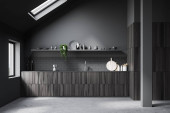 Zdjęcie "Wnętrze stylowej kuchni z białymi i szarymi ścianami, betonowa podłoga, szare szafki i stół jadalny. 3d renderowanie" może być wykorzystywane do celów osobistych i komercyjnych zgodnie z warunkami zakupionej licencji Royalty-free. Obraz jest dostępny do pobrania w jakości wysokiej rozdzielczości do 5760x3840.