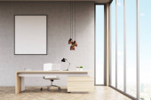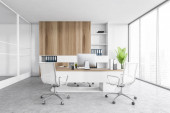 Białe, lekkie biuro z półką, krzesłem i stołem z komputerem, na marmurowej podłodze przy oknie. Business office room dla jednego pracownika biurowego, renderowanie 3D bez osób