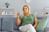 Poważna skupiona młoda kobieta w okularach pracująca na laptopie siedząc na kanapie w domu