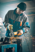 Ślusarz w specjalnych ubraniach i goglach pracuje w produkcji. Obróbka metali za pomocą szlifierki kątowej. Iskry w obróbce metali