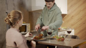 Miły mężczyzna zaprosił piękną blondynkę na wizytę, opowiada jej historie, piją wino przy kuchennym stole i stukają szklankami.