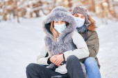 Ludzie w maskach medycznych trzymają dystans siedząc na ławce na zewnątrz. Środki ochronne podczas kwarantanny koronawirusów