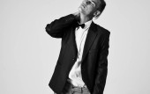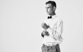 Elegancki młody człowiek w koszuli i krawacie na jasnym tle przycięte widok portret