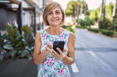 Latynoska kobieta w średnim wieku używająca smartfona i pijąca zabiera kawę do miasta.