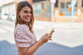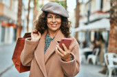Zdjęcie "Latynoska kobieta w średnim wieku używająca smartfona i pijąca zabiera kawę do miasta." może być wykorzystywane do celów osobistych i komercyjnych zgodnie z warunkami zakupionej licencji Royalty-free. Obraz jest dostępny do pobrania w jakości wysokiej rozdzielczości do 5760x3840.