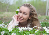 Młoda atrakcyjna kobieta stoi w pobliżu kwitnących jabłoni