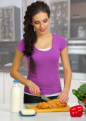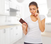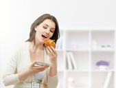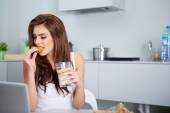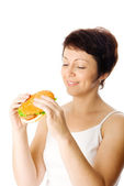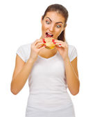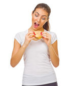 młoda dziewczyna z jabłkiem i hamburgera w jasnym pomieszczeniu