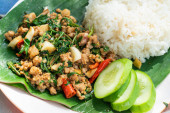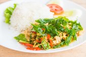 mieszaj smażoną mieloną wieprzowinę i bazylikę z ryżem - Thai street food style