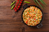 Smażony ryż z kurczakiem. Przygotowany i podawany w woku. Naturalne drewno w tle. Widok z góry.
