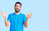 Zdjęcie "Młody Latynos ubrany w luźne ubrania zdumiony i zaskoczony patrząc w górę i wskazując palcami i podniesionymi ramionami. " może być wykorzystywane do celów osobistych i komercyjnych zgodnie z warunkami zakupionej licencji Royalty-free. Obraz jest dostępny do pobrania w jakości wysokiej rozdzielczości do 5760x3840.