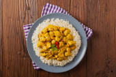 Kurczak w sosie curry. Podawany z ryżem. Z przodu. Naturalne drewniane tło.
