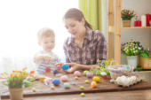 Matka i jej syn malują wielkanocne jaja. Szczęśliwa rodzina przygotowuje się do Wielkanocy.