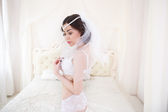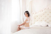 Portret pięknej młodej kobiety z długimi włosami w koronkowej bieliźnie pozującej przy oknie