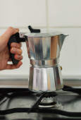 włoski dzbanek do kawy w ręku na czarny kuchenka elektryczna.