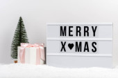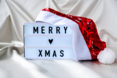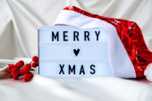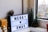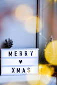 Zdjęcie "LightBox z tekstem MERRY XMAS Boże Narodzenie na parapecie. Dekoracje noworoczne, girlandy i choinki. Okno pomalowane sprayem śnieżnym. Hygge do domu" może być wykorzystywane do celów osobistych i komercyjnych zgodnie z warunkami zakupionej licencji Royalty-free. Obraz jest dostępny do pobrania w jakości wysokiej rozdzielczości do 5760x3840.