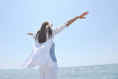 szczęśliwa rodzina bawi się z psem na plaży