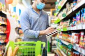 Zdjęcie "Młody mężczyzna w masce medycznej z zakupami wózków na rynku" może być wykorzystywane do celów osobistych i komercyjnych zgodnie z warunkami zakupionej licencji Royalty-free. Obraz jest dostępny do pobrania w jakości wysokiej rozdzielczości do 5760x3840.