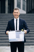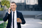 Businessman use smartphone to send voice messages outdoors at downtown. Young business man talking on phone near modern office building.