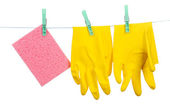gąbki kuchenne i gumowe rękawice wiszące na lina na białym tle