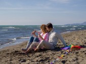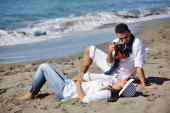 szczęśliwa rodzina bawi się z psem na plaży