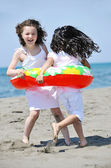 szczęśliwa rodzina bawi się z psem na plaży