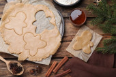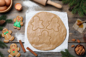 Zdjęcie "Kobieta robi świąteczne pierniki mężczyzna ciasteczka przy drewnianym stole, widok z góry" może być wykorzystywane do celów osobistych i komercyjnych zgodnie z warunkami zakupionej licencji Royalty-free. Obraz jest dostępny do pobrania w jakości wysokiej rozdzielczości do 5760x3840.