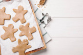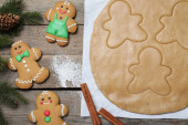 Kobieta robi świąteczne pierniki mężczyzna ciasteczka przy drewnianym stole, widok z góry