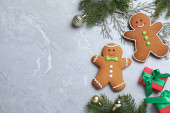 Płaska kompozycja układanki z domowymi piernikowymi ciasteczkami na jasnoszarym stole