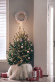 Stylowy pokój z dekoracjami świątecznymi. Uroczysty wystrój wnętrz