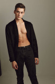 mężczyzna z napompowanym tułowiem na jasnym tle w czarnych spodniach rozkłada nogi na boki