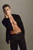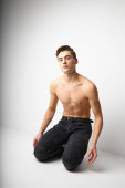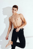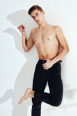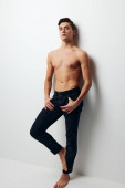Zdjęcie "mężczyzna z napompowanym tułowiem na jasnym tle w czarnych spodniach rozkłada nogi na boki" może być wykorzystywane do celów osobistych i komercyjnych zgodnie z warunkami zakupionej licencji Royalty-free. Obraz jest dostępny do pobrania w jakości wysokiej rozdzielczości do 5760x3840.