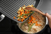 Kobiece dłonie ze smacznym pilafem i drewnianą łyżką na tle koloru