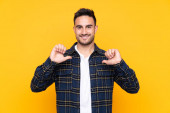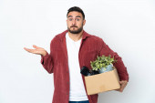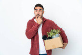 Zdjęcie "Młody biały mężczyzna robi ruch, podnosząc pudełko pełne rzeczy odizolowanych na białym tle, wykonując gest telefoniczny. Oddzwoń." może być wykorzystywane do celów osobistych i komercyjnych zgodnie z warunkami zakupionej licencji Royalty-free. Obraz jest dostępny do pobrania w jakości wysokiej rozdzielczości do 5760x3840.