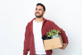 Młody biały mężczyzna robi ruch, podnosząc pudełko pełne rzeczy odizolowanych na białym tle, wykonując gest telefoniczny. Oddzwoń.