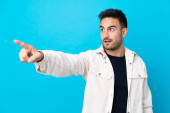 młody fotograf człowiek odizolowany na niebieskim tle pokazuje kciuk w dół z negatywnym wyrazem