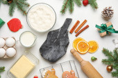 Kobieta przygotowująca świąteczną piekarnię na stole, widok z góry