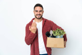 Zdjęcie "Młody biały mężczyzna robi ruch podnosząc pudełko pełne rzeczy odizolowanych na białym tle, licząc pięć palcami." może być wykorzystywane do celów osobistych i komercyjnych zgodnie z warunkami zakupionej licencji Royalty-free. Obraz jest dostępny do pobrania w jakości wysokiej rozdzielczości do 5760x3840.
