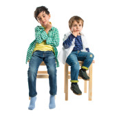 Boys making a victory sign on wooden chair over white background