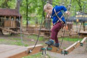 Młody uroczy chłopiec w letniej odzieży, uprzęży bezpieczeństwa i kasku dołączone z karabinu do kabla porusza się powoli wzdłuż liny sposób na zielonych drzew słoneczny bokeh tle. Sport, gra, koncepcja czasu wolnego.