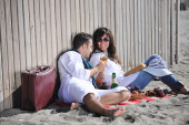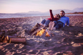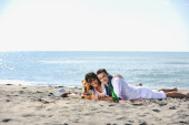 szczęśliwa rodzina bawi się z psem na plaży
