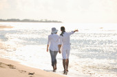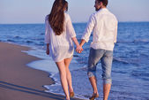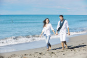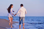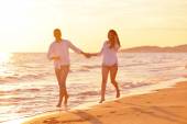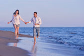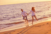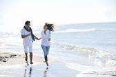 szczęśliwa rodzina bawi się z psem na plaży