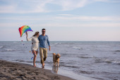 szczęśliwa rodzina bawi się z psem na plaży