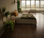Łóżko typu king size z białą i zieloną pościelą, duże okno i obraz na ścianie w jasnym wnętrzu pokoju hotelowego. zielone rośliny wokół łóżka.